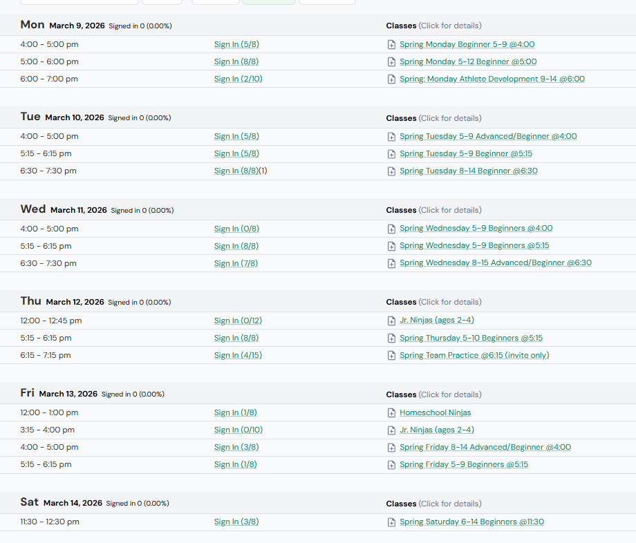 Each session is eight weeks, where Ninjas chose a one hour class, and come to that time slot each week. The classes, and obstacles, will be different each week and cover; balance, grip strength, swinging, etc… The session will conclude with a mini competition.